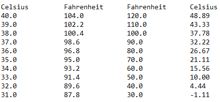 Celsius Fahrenheit Fahrenheit Celsius 40.0 104.0 120.0 48.89 39.0 102.2 110.0 43.33 38.0 100.4 100.0 37.78 37.0 98.6 90.0 32.22 36.0 96.8 80.0 26.67 35.0 95.0 70.0 21.11 34.0 93.2 60.0 15.56 33.0 91.4 50.0 10.00 32.0 89.6 40.0 4.44 31.0 87.8 30.0 -1.11