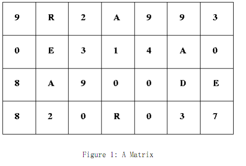 Your job is to find out the secret number hidden in a matrix, each of whose element is a digit ('0'-'9') or a letter ('A'-'Z'). You can see an example matrix in Figure 1.