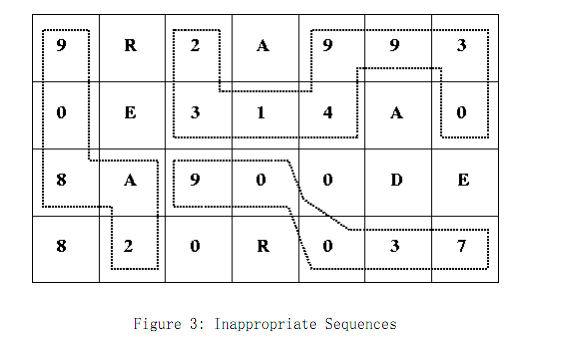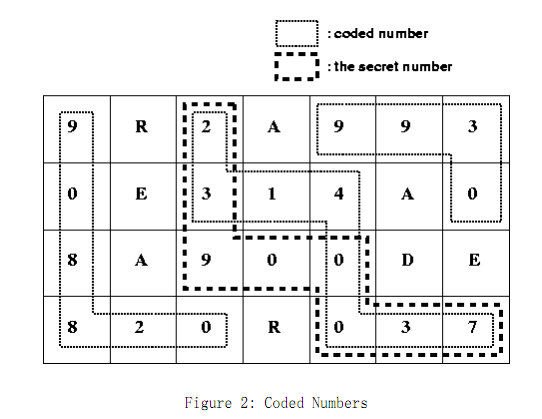 Four coded numbers in the matrix in Figure 1, i.e., 908820, 23140037, 23900037, and 9930, are depicted in Figure 2. As you may see, in general, two or more coded numbers may share a common subsequence. In this case, the secret number is 23900037, which is the largest among the set of all coded numbers in the matrix.