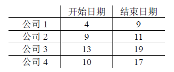 上例中,最多将会堂租借给两家公司。租借策略分别是租给公司1和公司3,或是公司2和公司3,也可以是公司1和公司4。注意会议中心一天最多租借给一个公司,所以公司1和公司2不能同时租借会议中心,因为他们在第九天重合了。