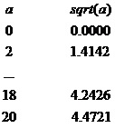 a sqrt(a) 0 0.0000 1 1.0000 2 1.4142 3 1.7321 4 2.0000 5 2.2361 6 2.4495 7 2.6458 8 2.8284 9 3.0000 10 3.1623 11 3.3166 12 3.4641 13 3.6056 14 3.7417 15 3.8730 16 4.0000 17 4.1231 18 4.2426 19 4.3589 20 4.4721