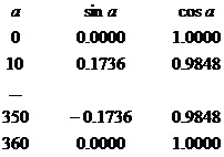 a sin(a) cos(a) 0 0.0000 1.0000 10 0.1736 0.9848 20 0.3420 0.9397 30 0.5000 0.8660 40 0.6428 0.7660 50 0.7660 0.6428 60 0.8660 0.5000 70 0.9397 0.3420 80 0.9848 0.1736 90 1.0000 0.0000 100 0.9848 -0.1736