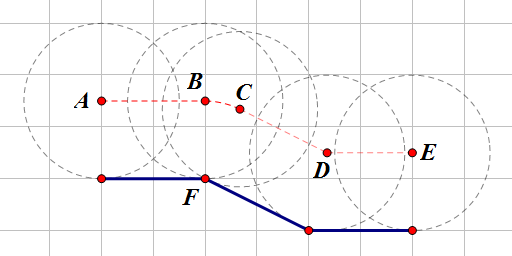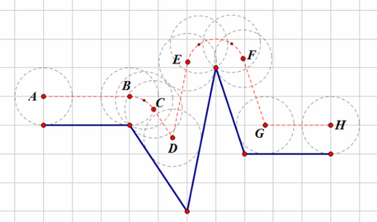 上图给出了一个简单的路面的例子,其中蓝色实线为路面,红色虚线为车轮轴经过的路径。在这个例子中,栋栋的前轮轴从A点出发,水平走到B点,然后绕着地面的F点到C点(绕出一个圆弧),再沿直线下坡到D点,最后水平走到E点,在这个图中地面的坐标依次为:(0, 0), (2, 0), (4, -1), (6, -1),前轮半径为1.50,前轮轴前进的距离依次为: